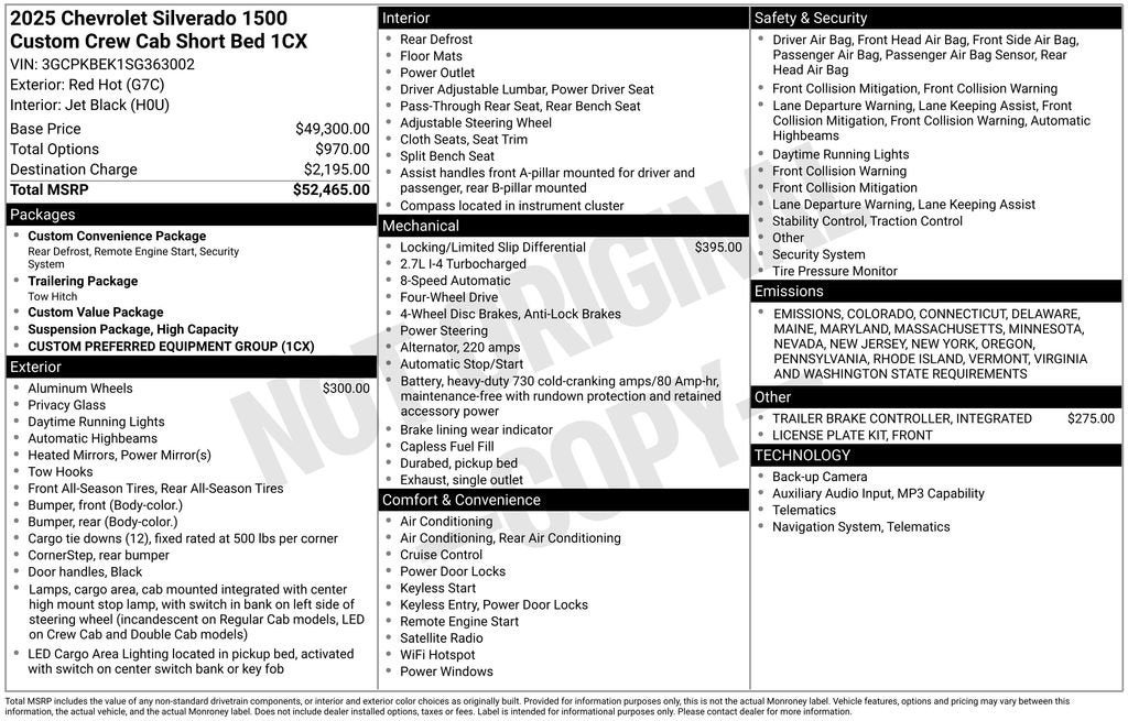 Custom 8-Speed Automatic, 4WD, Black Cloth, 10-Way Power Driver Seat w/Lumbar, 120-Volt Bed Mounted Power Outlet, 120-Volt Interior Power Outlet, 3.5 Monochromatic Display Driver Info Center, 3GCUYDET6LG263470, Apple CarPlay/Android Auto, Black Alloy Wheels, Bluetooth® For Phone, Brake assist, Color-Keyed Carpeting Floor Covering, Custom Convenience Package, Custom Value Package, Deep-Tinted Glass, Dual Rear USB Ports (Charge Only), Electric Rear-Window Defogger, Electronic Cruise Control, EZ Lift Power Lock & Release Tailgate, Front Frame-Mounted Black Recovery Hooks, Front Rubberized Vinyl Floor Mats, HD Rear Vision Camera, Heated door mirrors, High Capacity Suspension Package, LED Cargo Area Lighting, Manual Tilt Wheel Steering Column, OnStar Services Capable, Power Front Windows w/Driver Express Up/Down, Power Front Windows w/Passenger Express Down, Power Rear Windows w/Express Down, Preferred Equipment Group 1CX, Rear 60/40 Folding Bench Seat (Folds Up), Rear Rubberized-Vinyl Floor Mats, Rear window defroster, Remote Keyless Entry, Remote Vehicle Starter System, SiriusXM Trial Subscription, Split folding rear seat, Standard Tailgate, Teen Driver, Theft Deterrent System (Unauthorized Entry), Tire Pressure Monitoring System, Trailering Package, Wi-Fi Hot Spot Capable. Price includes: $1000 - GM Bonus Cash. Exp. 02/02/2026 $1250 - Chevrolet Trade Assistance Bonus Cash Program. Exp. 02/02/2026 $2500 - Chevrolet Select Market Loyalty Purchase Program. Exp. 02/02/2026 $3000 - Chevrolet Consumer Cash Program. Exp. 02/02/2026 Discount available on eligible purchases when you finance through a participating preferred lender and trade in a 2016 or newer vehicle with fewer than 75,000 miles. Customers using outside financing or manufacturer special APR programs (including 0%) are not eligible. All financing subject to credit approval and program availability. Offer valid through Exp. 02/27/2026. See dealer for details Discount available on eligible purchases when you finance through a participating preferred lender and trade in a 2016 or newer vehicle with fewer than 75,000 miles. Customers using outside financing or manufacturer special APR programs (including 0%) are not eligible. All financing subject to credit approval and program availability. Offer valid through Exp. 02/28/2026. See dealer for details Discount available on eligible purchases when you finance through a participating preferred lender and trade in a 2016 or newer vehicle with fewer than 75,000 miles. Customers using outside financing or manufacturer special APR programs (including 0%) are not eligible. All financing subject to credit approval and program availability. Offer valid through Exp. 01/31/2031. See dealer for details