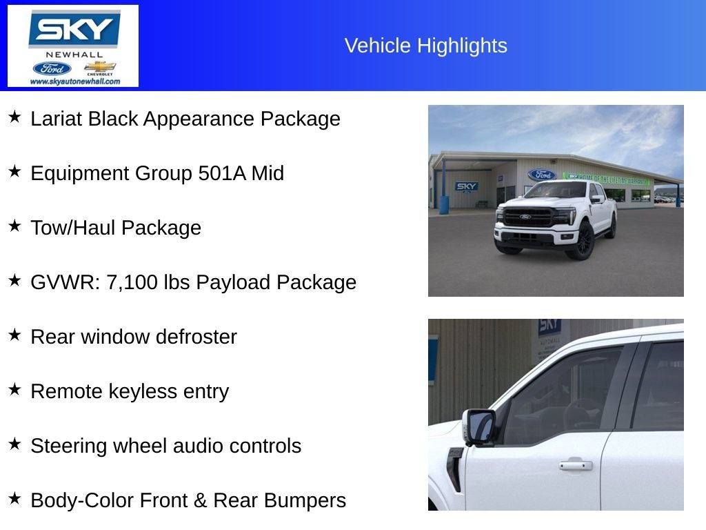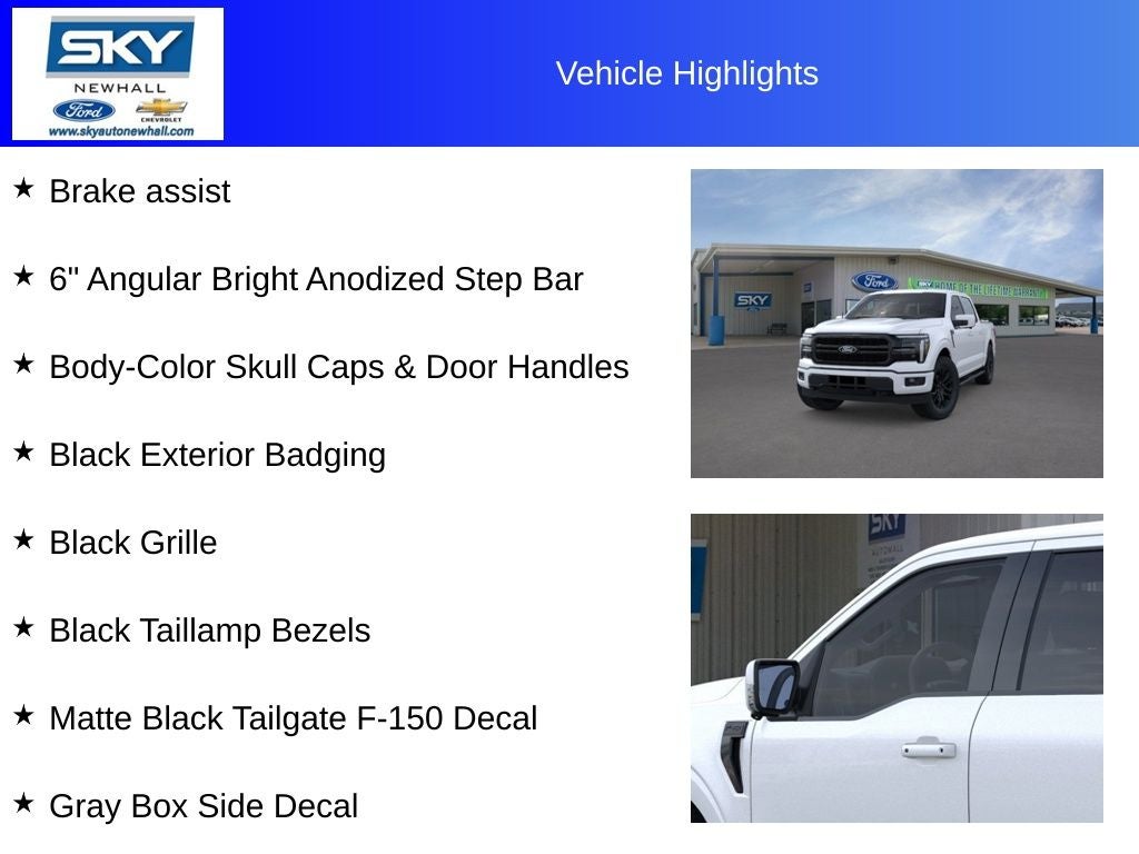 Lariat 4WD, 6 Angular Bright Anodized Step Bar, ActiveX Trimmed Bucket Seats (B), Black Alloy Wheels, Black Exterior Badging, Black Grille, Black Taillamp Bezels, Body-Color Front & Rear Bumpers, Body-Color Skull Caps & Door Handles, Brake assist, Dark Interior Appliques, Equipment Group 501A Mid, Gray Box Side Decal, GVWR: 7,100 lbs Payload Package, Heated door mirrors, Heated front seats, Heated steering wheel, Illuminated Driver & Passenger Visors, Integrated Trailer Brake Controller, Lariat Black Appearance Package, Matte Black Tailgate F-150 Decal, Power-Sliding Rear Window, Rear window defroster, Remote keyless entry, Split folding rear seat, Steering wheel audio controls, Tow/Haul Package, Ventilated front seats, Wheels: 20 Chrome-Like PVD.