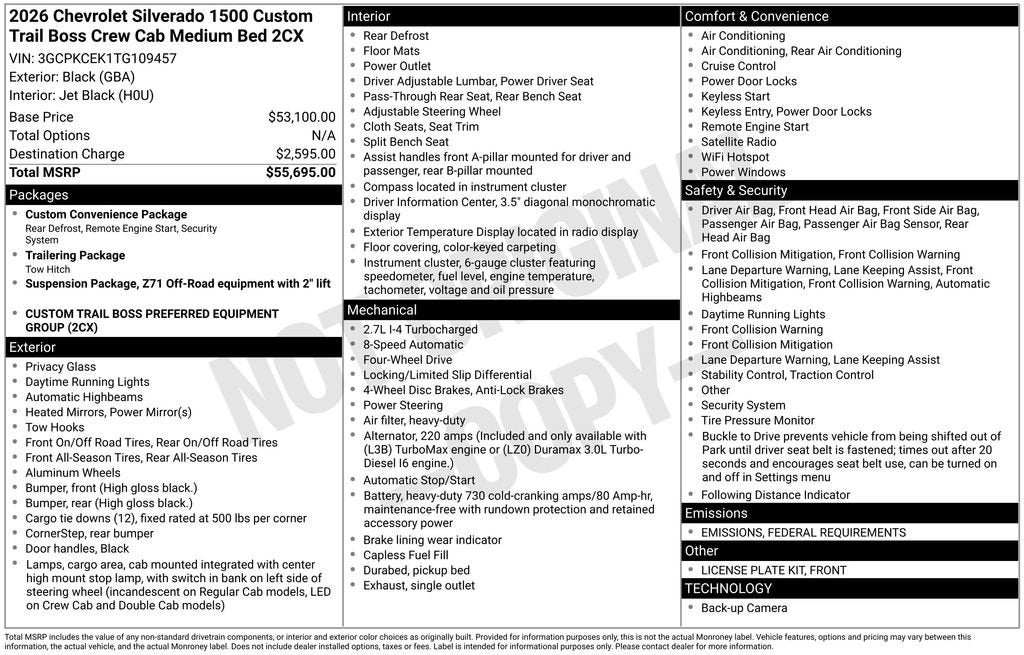 Custom Trail Boss 8-Speed Automatic, 4WD, Black Cloth, 10-Way Power Driver Seat w/Lumbar, 120-Volt Bed Mounted Power Outlet, 120-Volt Interior Power Outlet, 3.5 Monochromatic Display Driver Info Center, 3GCUYDET6LG263470, Apple CarPlay/Android Auto, Auto-Locking Rear Differential, Black Alloy Wheels, Bluetooth® For Phone, Brake assist, Color-Keyed Carpeting Floor Covering, Custom Convenience Package, Deep-Tinted Glass, Dual Rear USB Ports (Charge Only), Electric Rear-Window Defogger, Electronic Cruise Control, EZ Lift Power Lock & Release Tailgate, Front Rubberized Vinyl Floor Mats, HD Rear Vision Camera, Heated door mirrors, Heavy-Duty Air Filter, Hill Descent Control, LED Cargo Area Lighting, Manual Tilt Wheel Steering Column, OnStar Services Capable, Performance Red Recovery Hooks, Power Front Windows w/Driver Express Up/Down, Power Front Windows w/Passenger Express Down, Power Rear Windows w/Express Down, Preferred Equipment Group 2CX, Rear 60/40 Folding Bench Seat (Folds Up), Rear Rubberized-Vinyl Floor Mats, Rear window defroster, Remote Keyless Entry, Remote Vehicle Starter System, SiriusXM Trial Subscription, Split folding rear seat, Standard Tailgate, Suspension Package, Teen Driver, Theft Deterrent System (Unauthorized Entry), Tire Pressure Monitoring System, Trailering Package, Wi-Fi Hot Spot Capable. Price includes: $1000 - GM Bonus Cash. Exp. 02/02/2026 $1250 - Chevrolet Trade Assistance Bonus Cash Program. Exp. 02/02/2026 $2500 - Chevrolet Select Market Loyalty Purchase Program. Exp. 02/02/2026 $3000 - Chevrolet Consumer Cash Program. Exp. 02/02/2026 Discount available on eligible purchases when you finance through a participating preferred lender and trade in a 2016 or newer vehicle with fewer than 75,000 miles. Customers using outside financing or manufacturer special APR programs (including 0%) are not eligible. All financing subject to credit approval and program availability. Offer valid through Exp. 02/27/2026. See dealer for details Discount available on eligible purchases when you finance through a participating preferred lender and trade in a 2016 or newer vehicle with fewer than 75,000 miles. Customers using outside financing or manufacturer special APR programs (including 0%) are not eligible. All financing subject to credit approval and program availability. Offer valid through Exp. 02/28/2026. See dealer for details Discount available on eligible purchases when you finance through a participating preferred lender and trade in a 2016 or newer vehicle with fewer than 75,000 miles. Customers using outside financing or manufacturer special APR programs (including 0%) are not eligible. All financing subject to credit approval and program availability. Offer valid through Exp. 01/31/2031. See dealer for details