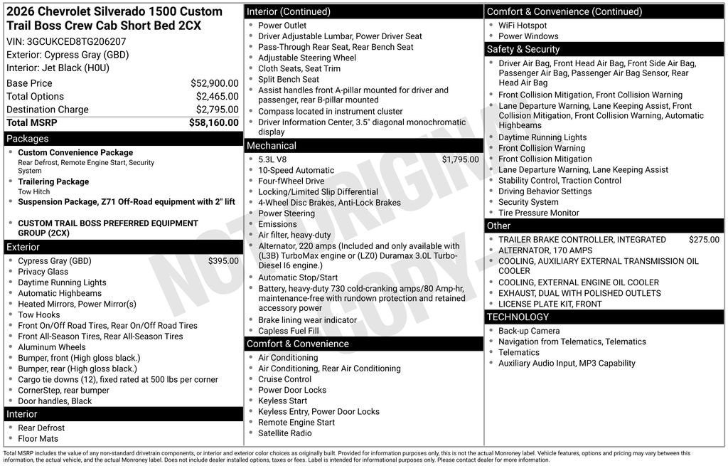 Custom Trail Boss 10-Speed Automatic, 4WD, Black Cloth, 10-Way Power Driver Seat w/Lumbar, 120-Volt Bed Mounted Power Outlet, 120-Volt Interior Power Outlet, 3.5 Monochromatic Display Driver Info Center, 3GCUYDET6LG263470, Apple CarPlay/Android Auto, Auto-Locking Rear Differential, Black Alloy Wheels, Bluetooth® For Phone, Brake assist, Color-Keyed Carpeting Floor Covering, Custom Convenience Package, Deep-Tinted Glass, Dual Rear USB Ports (Charge Only), Electric Rear-Window Defogger, Electronic Cruise Control, EZ Lift Power Lock & Release Tailgate, Front Rubberized Vinyl Floor Mats, HD Rear Vision Camera, Heated door mirrors, Heavy-Duty Air Filter, Hill Descent Control, LED Cargo Area Lighting, Manual Tilt Wheel Steering Column, OnStar Services Capable, Performance Red Recovery Hooks, Power Front Windows w/Driver Express Up/Down, Power Front Windows w/Passenger Express Down, Power Rear Windows w/Express Down, Preferred Equipment Group 2CX, Rear 60/40 Folding Bench Seat (Folds Up), Rear Rubberized-Vinyl Floor Mats, Rear window defroster, Remote Keyless Entry, Remote Vehicle Starter System, SiriusXM Trial Subscription, Split folding rear seat, Standard Tailgate, Suspension Package, Teen Driver, Theft Deterrent System (Unauthorized Entry), Tire Pressure Monitoring System, Trailering Package, Wi-Fi Hot Spot Capable. Price includes: $1250 - Chevrolet Trade Assistance Bonus Cash Program. Exp. 02/02/2026 $1500 - GM Bonus Cash. Exp. 02/02/2026 $3250 - Chevrolet Consumer Cash Program. Exp. 02/02/2026