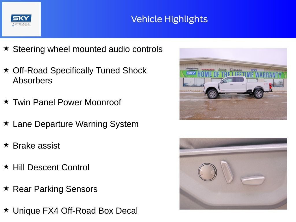 White Metallic 2026 Ford F-350SD Lariat 4WD 10-Speed Automatic 6.7L High Output Power Stroke V8 Diesel 4WD, 4-Way Adjustable Headrests, 5th Wheel/Gooseneck Hitch Prep Package, 6 Angular Bright Anodized Step Bars, Alloy wheels, Brake assist, Chrome Door Handles, Chrome Exhaust Tip, Chrome Package, Ford Connectivity Package (1-Year Included), FX4 Off-Road Package, GVWR: 12,000 lb Payload Package, Head-Up Display, Heated door mirrors, Heated front seats, Heated rear seats, Heated steering wheel, Hill Descent Control, Internet access capable: 5G Modem - Ford Connectivity Package, Lane Departure Warning System, Lariat Premium Package, Lariat Ultimate Package, Off-Road Specifically Tuned Shock Absorbers, Order Code 618A, Power-Deployable Running Boards, Power-Sliding Rear-Window w/Defrost, Privacy Glass, Pro Trailer Backup Assist, Pro Trailer Hitch Assist, Radio: B&O Unleashed Sound System by Bang & Olufsen, Rear Parking Sensors, Rear window defroster, Remote keyless entry, SiriusXM w/360L, Snow Plow Prep Package, Split folding rear seat, Steering wheel mounted audio controls, SYNC 4 w/Enhanced Voice Recognition, Tailgate Step & Handle, Twin Panel Power Moonroof, Unique Chrome Mirror Caps, Unique FX4 Off-Road Box Decal, Ventilated front seats, Wheels: 20 Chrome PVD Aluminum. Price includes: Discount available on eligible purchases when you finance through a participating preferred lender and trade in a 2016 or newer vehicle with fewer than 75,000 miles. Customers using outside financing or manufacturer special APR programs (including 0%) are not eligible. All financing subject to credit approval and program availability. Offer valid through Exp. 01/31/2030. See dealer for details Discount available on eligible purchases when you finance through a participating preferred lender AND trade in a 2016 or newer vehicle with fewer than 75,000 miles. Customers using outside financing or manufacturer special APR programs (including 0%) are not eligible. All financing subject to credit approval and program availability. Offer valid through Exp. 01/30/2031. See dealer for details