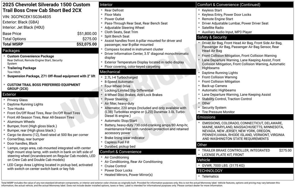 Custom Trail Boss 8-Speed Automatic, 4WD, Jet Black Cloth. Price includes: $1000 - GM Bonus Cash. Exp. 11/03/2025 $1250 - Chevrolet Trade Assistance Bonus Cash Program. Exp. 11/03/2025 $2500 - Chevrolet Select Market Loyalty Purchase Program. Exp. 11/03/2025 $3000 - Chevrolet Consumer Cash Program. Exp. 11/03/2025