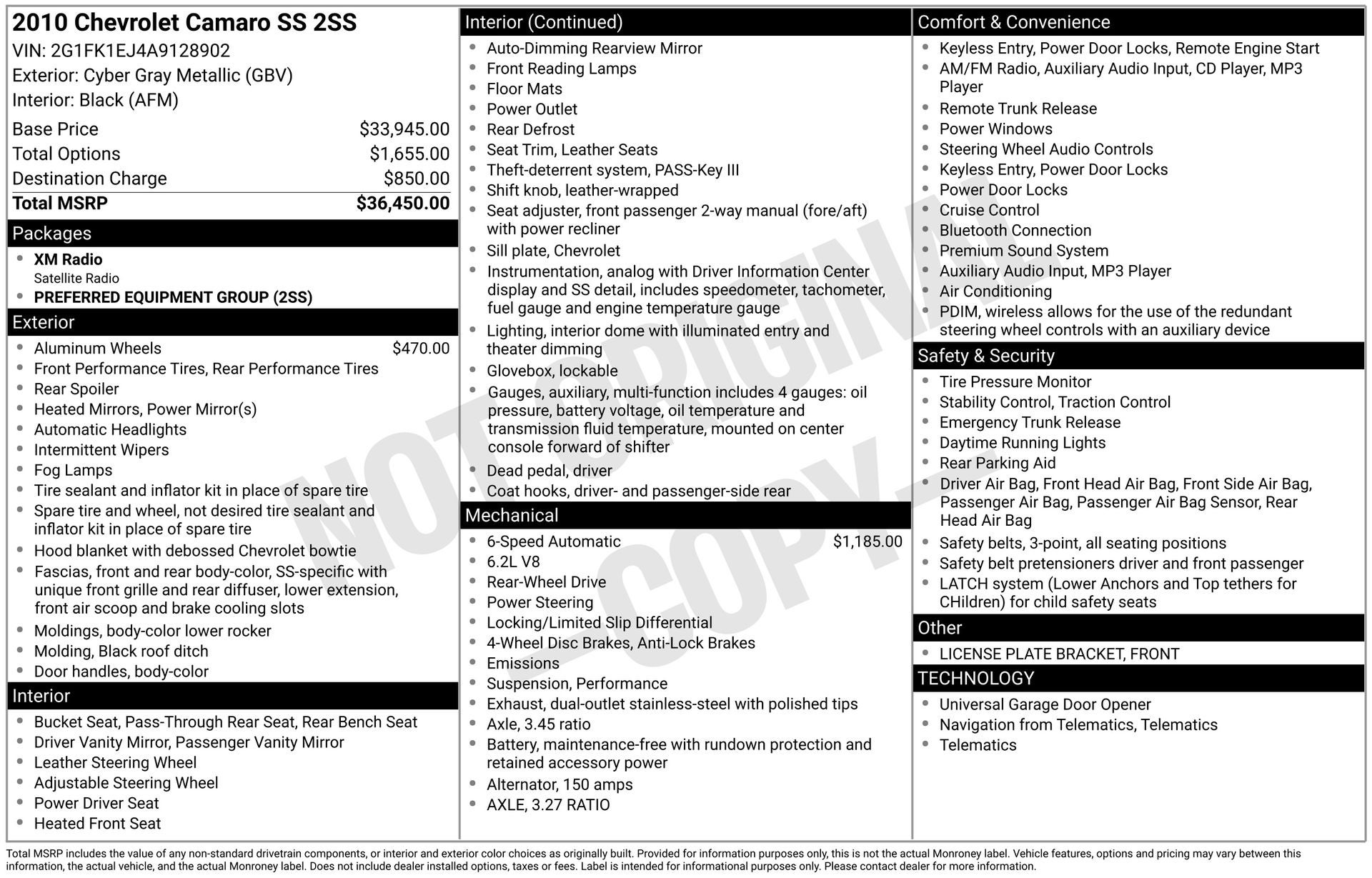 6.2L V8 SFI, 2 Front Cup Holders, 3-Spoke Leather-Wrapped Steering Wheel, 4-Wheel Antilock 4-Wheel Disc Brakes, Alloy wheels, Analog Instrumentation, Audio System Feature USB Port, Bluetooth® For Phone, Boston Acoustics Premium 9-Speaker Audio System, Brake assist, Cargo Convenience Net, Carpeted Front Floor Mats, Electric Rear-Window Defogger, Electronic Cruise Control, Gauges, Heated door mirrors, Heated Driver & Front Passenger Seats, Inside Rearview Autodimming Mirror, LATCH System, Leather Shift Knob, Leather-Appointed Seat Trim, Leather-Wrapped Shift Knob, Maintenance-Free Battery, Manual Rake & Telescopic Steering Column, OnStar 1-Year Directions & Connections Plan, Power Programmable Door Locks, Preferred Equipment Group 2SS, Rear Parking Sensors, Rear window defroster, Remote Keyless Entry, Remote Vehicle Starter System, Spoiler, StabiliTrak, Stainless-Steel Dual-Outlet Exhaust, Steering Wheel Mounted Audio Controls, Steering wheel mounted audio controls, Universal Home Remote, Wireless PDIM, XM Radio. Cyber Gray Metallic 2010 Chevrolet Camaro SS 2SS RWD 6-Speed Automatic with TapShift 6.2L V8 SFI