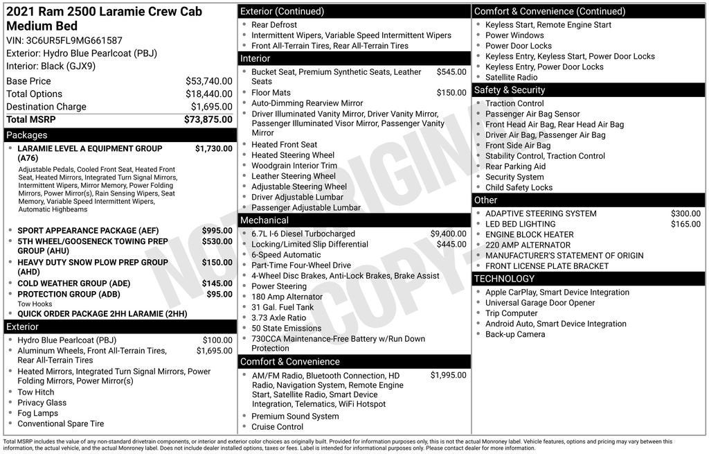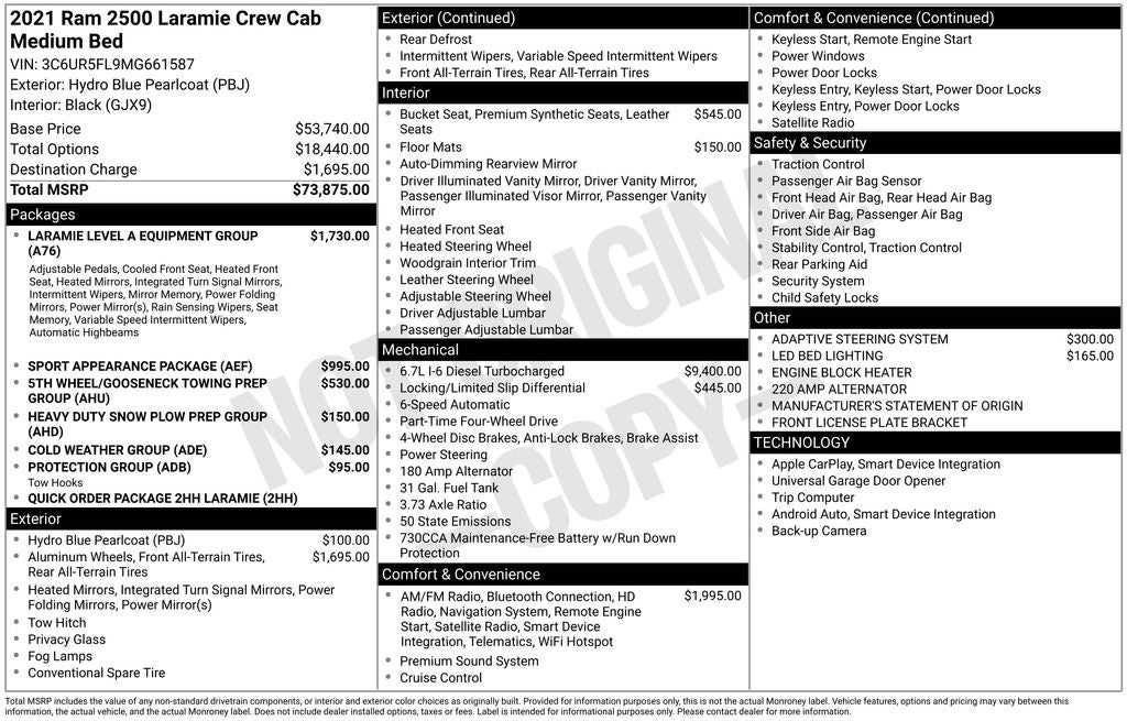 220 Amp Alternator, 2nd Row In Floor Storage Bins, 5th Wheel/Gooseneck Towing Prep Group, Apple CarPlay/Android Auto, Auto High Beam Headlamp Control, Black Alloy Wheels, Black Interior Accents, Body Color Door Handles, Body Color Grille Surround, Brake assist, Cold Weather Group, Engine Block Heater, Exterior Mirrors w/Memory, Foam Bottle Insert (Door Trim Panel), Heated door mirrors, Heated Front Seats, Heated Steering Wheel, Heavy Duty Snow Plow Prep Group, Laramie Level A Equipment Group, Leather steering wheel, Leather Trim 40/20/40 Bench Seat, Mirror-Mounted Aux Reverse Lamps, MOPAR Winter Front Grille Cover, Painted Front Bumper, Painted Rear Bumper, ParkView Rear Back-Up Camera, Power Adjustable Convex Aux Mirrors, Power Adjustable Pedals w/Memory, Power Chrome Tow Mirrors w/Convex Spotter & Memory, Protection Group, Quick Order Package 2HH Laramie, Radio/Driver Seat/Mirrors/Pedals Memory, Rain Sensitive Windshield Wipers, Rear window defroster, Remote keyless entry, Remote Tailgate Release, Split folding rear seat, Sport Appearance Package, Sport Decal, Steering wheel audio controls, Tow Hooks, Ventilated Front Seats.