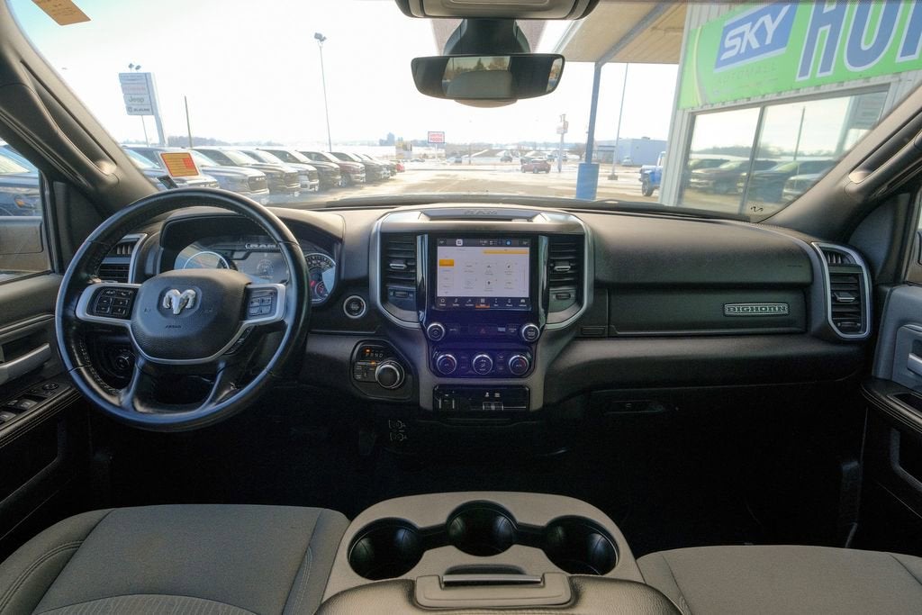 2nd Row In Floor Storage Bins, 40/20/40 Split Bench Seat, 4G LTE Wi-Fi Hot Spot, Apple CarPlay/Android Auto, Auto-Dimming Rear-View Mirror, Brake assist, Dual Glove Boxes, Foam Bottle Insert (Door Trim Panel), Footwell Courtesy Lamp, Front Fog Lamps, Glove Box Lamp, Heated door mirrors, Leather Wrapped Steering Wheel, Level A Equipment Group, Locking Lower Glove Box, Power Adjustable Pedals, Premium Cloth 40/20/40 Bench Seat, Quick Order Package 2GZ Big Horn, Rear Dome w/On/Off Switch Lamp, Remote keyless entry, Remote Start System, Steering Wheel Mounted Audio Controls, Sun Visors w/Illuminated Vanity Mirrors, Universal Garage Door Opener, Wheels: 18 x 8.0 Polished Aluminum.
