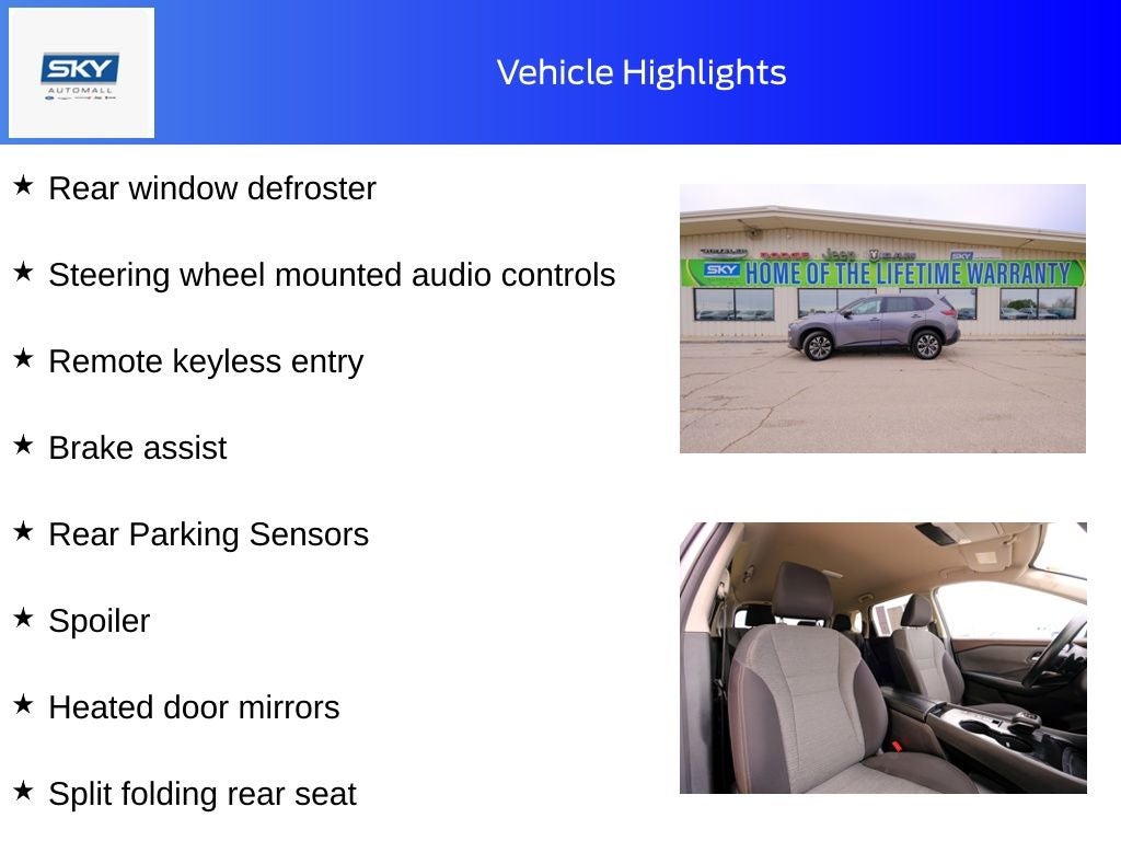 Alloy wheels, Brake assist, Heated door mirrors, Rear Parking Sensors, Rear window defroster, Remote keyless entry, Split folding rear seat, Spoiler, Steering wheel mounted audio controls. Gun Metallic 2023 Nissan Rogue SV FWD CVT with Xtronic 1.5L I3 Turbocharged DOHC 12V LEV3-ULEV50 201hp