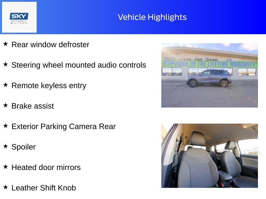 Alloy wheels, Brake assist, Exterior Parking Camera Rear, Heated door mirrors, Heated Front Bucket Seats, Heated steering wheel, Leather Shift Knob, Rear window defroster, Remote keyless entry, Split folding rear seat, Spoiler, Steering wheel mounted audio controls. Silver 2024 Volkswagen Taos 1.5T SE FWD 8-Speed Automatic with Tiptronic 1.5L I4 Turbocharged DOHC 16V LEV3-SULEV30 158hp