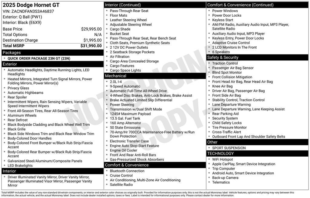 Apple CarPlay/Android Auto, Black Alloy Wheels, Brake assist, Heated door mirrors, Leather steering wheel, ParkView Rear Back-Up Camera, Quick Order Package 23N GT, Rear window defroster, Remote keyless entry, Spoiler.