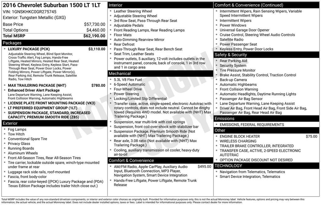 1st & 2nd Row Color-Keyed Carpeted Floor Mats, 2-Speed Active Electronic AutoTrac Transfer Case, 2nd Row 60/40 Split-Folding Manual Bench, 2nd Row Pwr Release 60/40 Split Folding Bench Seat, 3.42 Rear Axle Ratio, 3rd Row 60/40 Power Fold Split-Bench, 3rd Row Manual 60/40 Split-Folding Fold Flat Bench, 4-Wheel Antilock Disc Brakes, 5 12-Volt Auxiliary Power Outlets, Apple CarPlay, Auto-Dimming Inside Rear-View Mirror, Black Alloy Wheels, Black Assist Steps, Bose Premium Audio System Feature, Brake assist, Color-Keyed Carpeting Floor Covering, Driver & Front Passenger Airbags, Electronic Cruise Control w/Set & Resume Speed, Enhanced Driver Alert Package (Y86), Enhanced Driver Instrument Information Display, Extended-Range Remote Keyless Entry, Exterior Parking Camera Rear, Floor Console w/Storage Area, Fog Lamps, Forward Collision Alert Sensor Indicator, Front & Rear Parking Assist, Hands Free Power Liftgate, Heated 2nd Row Seats, Heated door mirrors, Heated Front Reclining Bucket Seats, Heated Leather Wrapped Steering Wheel, Integrated Trailer Brake Controller, Intellibeam Headlamps w/Automatic High Bean On/Off, Lane Keep Assist, Leather-Appointed Seat Trim, Leather-Wrapped Steering Wheel, License Plate Front Mounting Package, Luxury Package, Max Trailering Package, Memory Settings, OnStar Basic Plan For 5 Years, Passive Entry System, Power Folding & Adjustable Heated Outside Mirrors, Power Liftgate, Power Tilt & Telescoping Steering Column, Power-Adjustable Accelerator & Brake Pedals, Preferred Equipment Group 1LT, Premium Smooth Ride Suspension Package, Push Button Keyless Start, Rear air conditioning, Rear Cross-Traffic Alert Sensor Indicator, Rear Park Assist w/Audible Warning, Rear window defroster, Remote keyless entry, Roof-Mounted Luggage Rack Side Rails, Side Blind Zone Alert w/Lane Change Alert, SiriusXM Satellite Radio, Split folding rear seat, Spoiler, Standard Suspension Package, Steering wheel audio controls, Universal Home Remote, Wireless Charging.