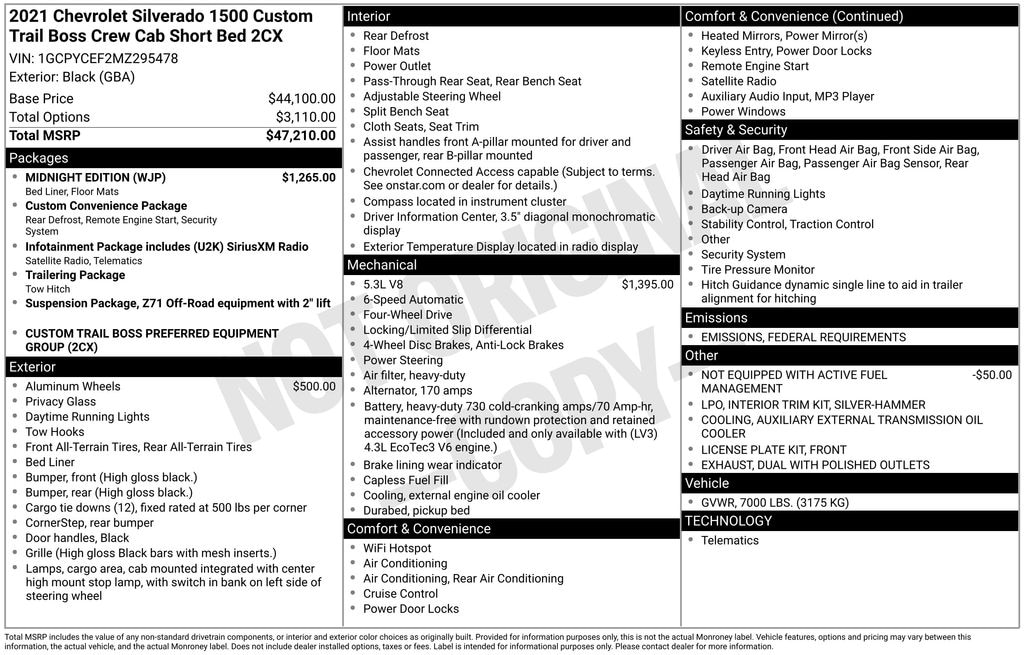 6-Speed Automatic Electronic with Overdrive, 4WD, Black Cloth, 170 Amp Alternator, 3.5" Diagonal Monochromatic Display, 3GCUYDET6LG263470, 4G LTE Wi-Fi Hot Spot Capable, All-Weather Floor Liner (LPO) (AAK), Apple CarPlay/Android Auto, Auto-Locking Rear Differential, Black Alloy Wheels, Black Dual Exhaust Tips, Bluetooth® For Phone, Brake assist, Chevytec Spray-On Black Bedliner, Color-Keyed Carpeting Floor Covering, Compass, Custom Convenience Package, Deep-Tinted Glass, Electric Rear-Window Defogger, Electronic Cruise Control, EZ Lift Power Lock & Release Tailgate, Front Rubberized Vinyl Floor Mats, Heated door mirrors, Heavy-Duty Air Filter, High Gloss Black Grille, Hill Descent Control, Infotainment Package, LED Cargo Area Lighting, Manual Tilt Wheel Steering Column, Midnight Edition, OnStar & Chevrolet Connected Services Capable, Performance Red Recovery Hooks, Power Door Locks, Power Front Windows w/Driver Express Up/Down, Power Front Windows w/Passenger Express Down, Power Rear Windows w/Express Down, Preferred Equipment Group 2CX, Rear 60/40 Folding Bench Seat (Folds Up), Rear Rubberized-Vinyl Floor Mats, Rear window defroster, Remote Keyless Entry, Remote Vehicle Starter System, Silver-Hammer Interior Trim Kit (LPO), SiriusXM Radio, Split folding rear seat, Standard Tailgate, Suspension Package, Trailering Package.