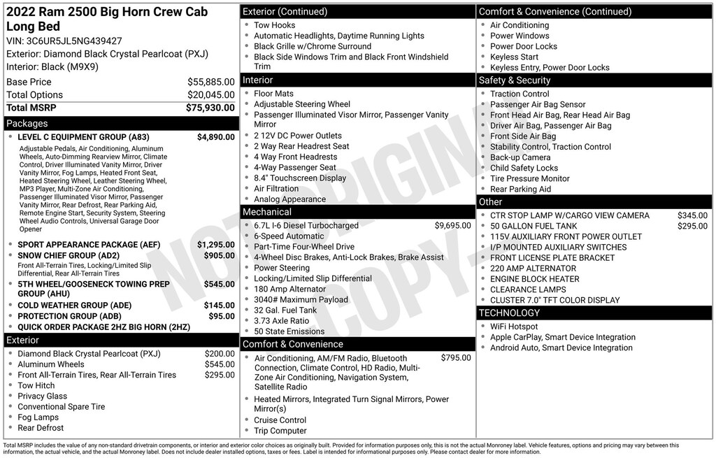 115V Auxiliary Front Power Outlet, 115V Auxiliary Rear Power Outlet, 220 Amp Alternator, 2nd Row In Floor Storage Bins, 4G LTE Wi-Fi Hot Spot, 5th Wheel/Gooseneck Towing Prep Group, Air Conditioning ATC w/Dual Zone Control, Anti-Spin Differential Rear Axle, Apple CarPlay/Android Auto, Auto-Dimming Rear-View Mirror, Black Interior Accents, Body Color Door Handles, Body Color Grille Surround, Brake assist, Clearance Lamps, Cluster 7.0" TFT Color Display, Cold Weather Group, Dampened Tailgate, Dual Glove Boxes, Engine Block Heater, Foam Bottle Insert (Door Trim Panel), Footwell Courtesy Lamp, Front Fog Lamps, Glove Box Lamp, Heated door mirrors, Heated Front Seats, Heated Steering Wheel, I/P Mounted Auxiliary Switches, Leather Wrapped Steering Wheel, LED Tail Lamps, Level C Equipment Group, Locking Lower Glove Box, Media Hub w/2 Charge Only USBs, MOPAR Winter Front Grille Cover, Painted Front Bumper, Painted Rear Bumper, ParkSense Front/Rear Park Assist System, ParkView Rear Back-Up Camera, Power Adjustable Pedals, Premium Cloth 40/20/40 Bench Seat, Protection Group, Quick Order Package 2HZ Big Horn, Rear Dome w/On/Off Switch Lamp, Rear Power Sliding Window, Rear Window Defroster, Remote keyless entry, Remote Start System, Security Alarm, Snow Chief Group, Sport Appearance Package, Sport Decal, Steering Wheel Mounted Audio Controls, Sun Visors w/Illuminated Vanity Mirrors, Universal Garage Door Opener, Wheels: 18" x 8.0" Polished Aluminum.